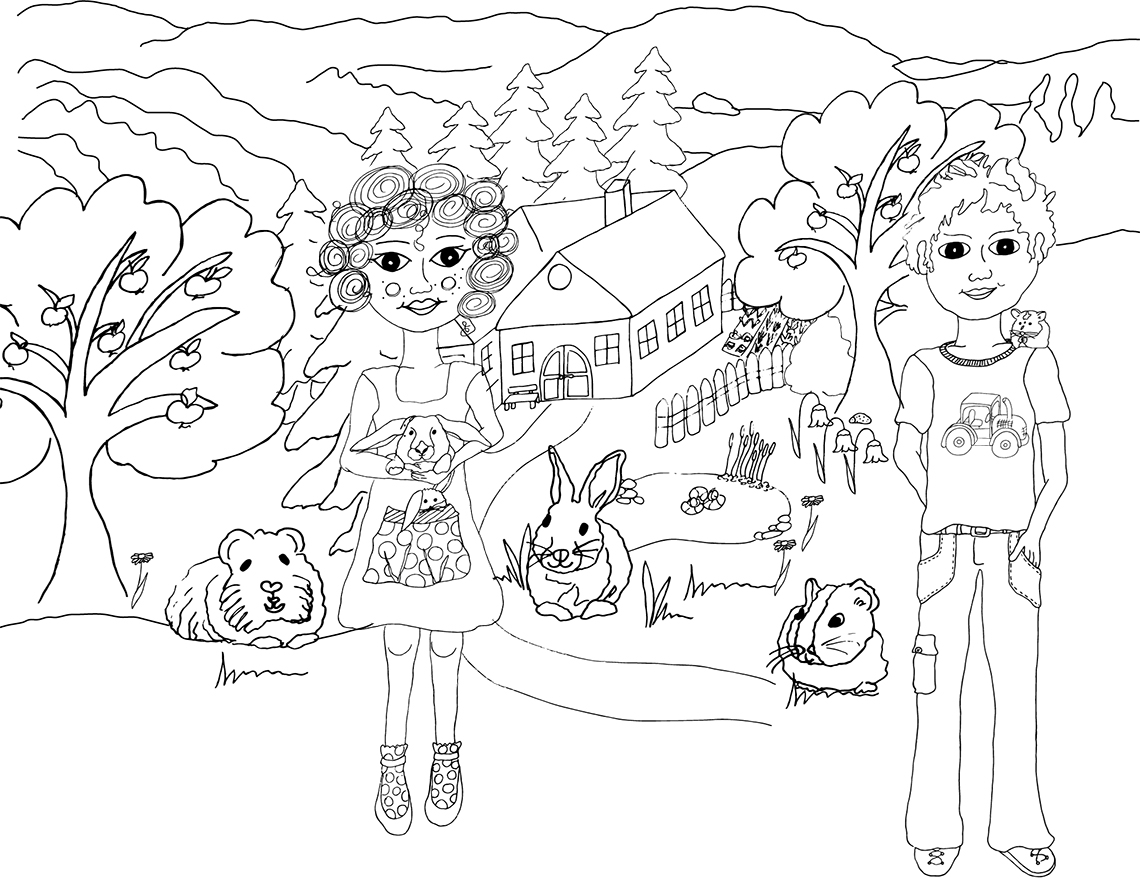 Hallo, ich bin die Hedi. Und der mit dem Hamster Lu ist mein Bruder Max. Wir leben mit unseren Eltern auf einem Bauernhof in der Buckligen Welt. Das ist cool! Denn da gibt es viele Tiere. Auch wenn Lore, die Häsin, mein absoluter Liebling ist. Und am liebsten liegen wir im Gras (aber nicht der Mama sagen!) und spielen mit ihnen. Unsere Welt ist lustig und bunt. So bunt, dass Du diese Seite ausdrucken kannst und Eli, Fips, Lore und Max gerne anmalen kannst, wie es Dir gefällt. Den Mo sogar grün im Gesicht. Hihi, dann paßt er perfekt zu den grünen Wiesen hier in Möltern!